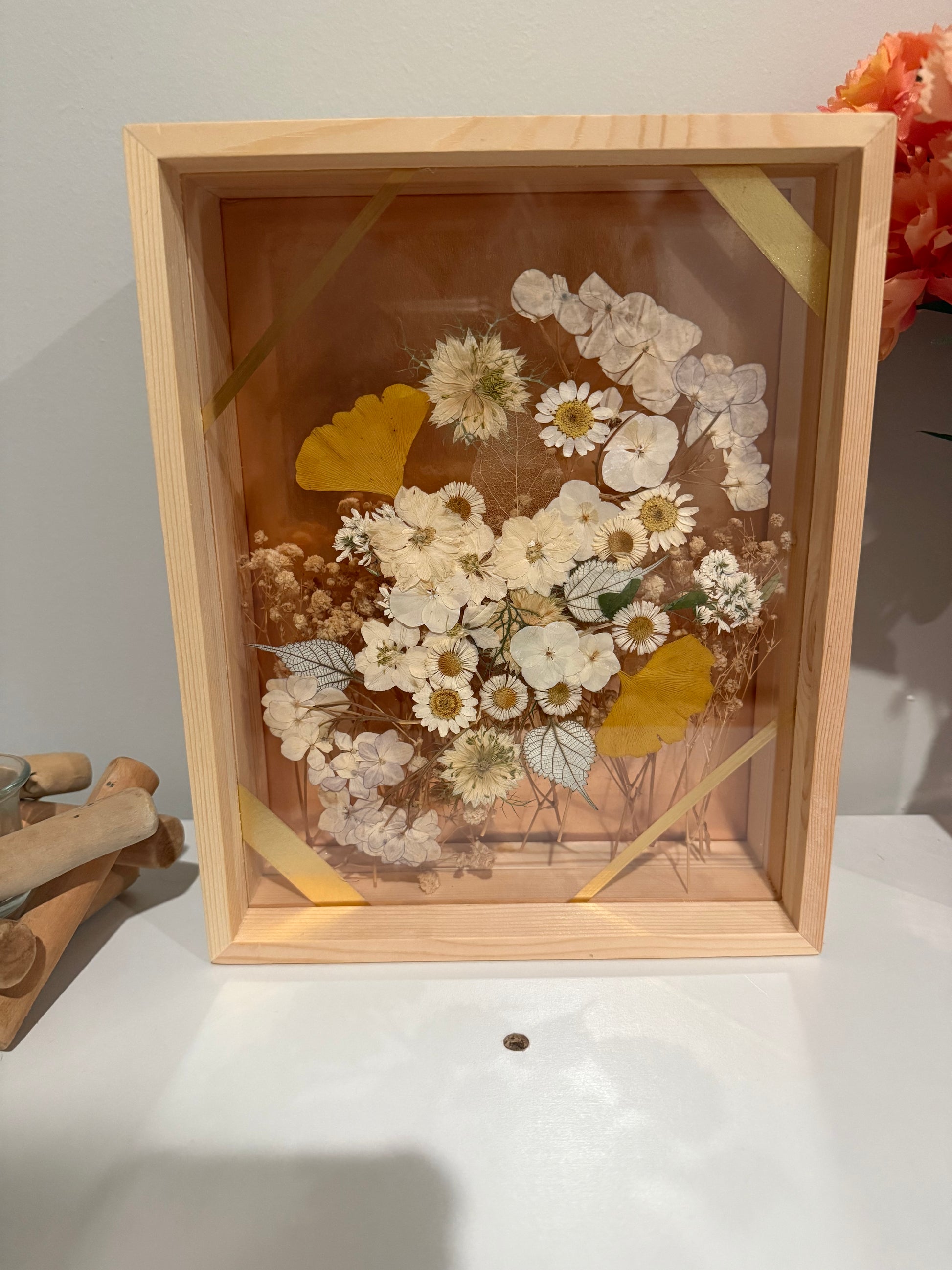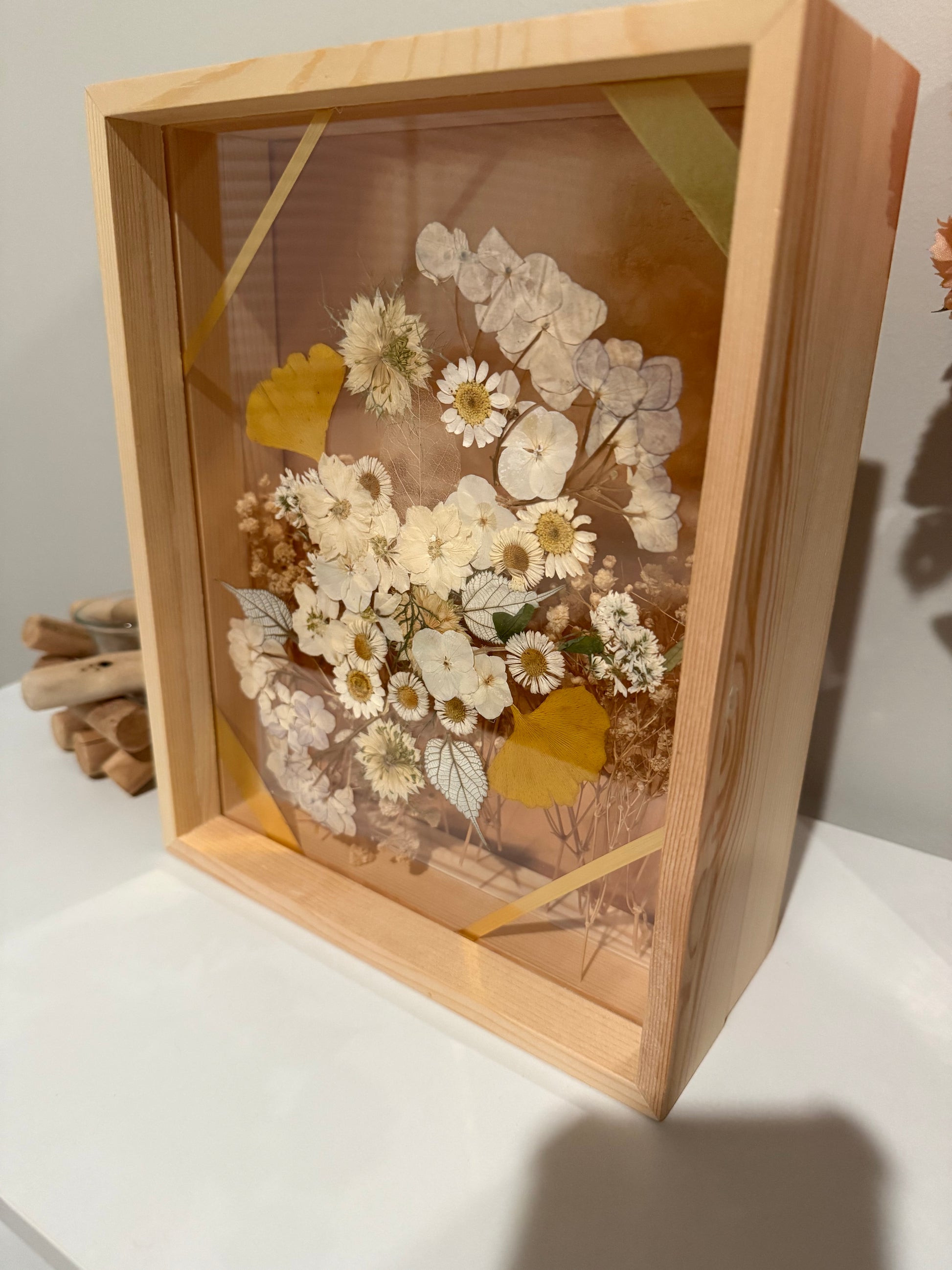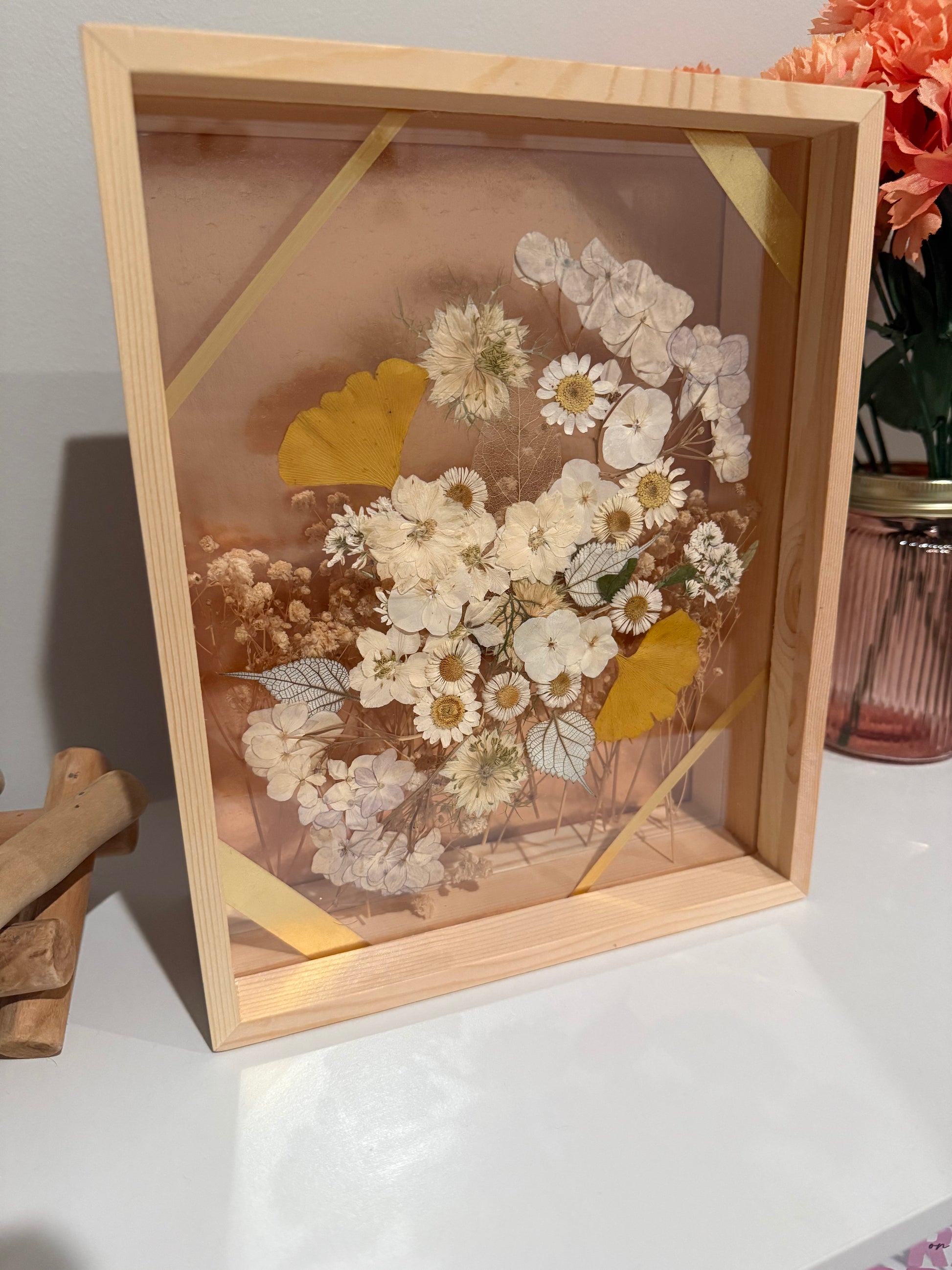 A serene arrangement of white and cream pressed blooms accented with golden leaves — capturing the warmth and purity of a sunlit meadow.